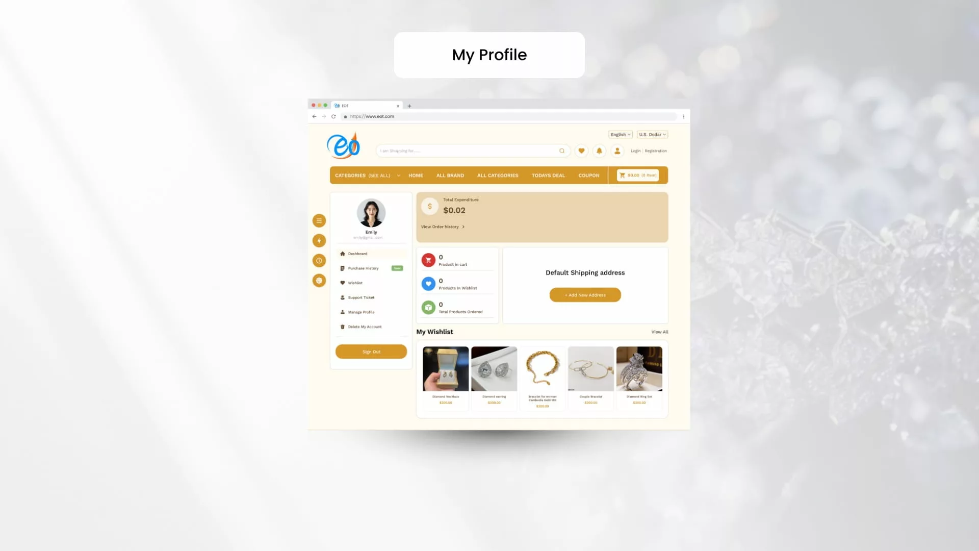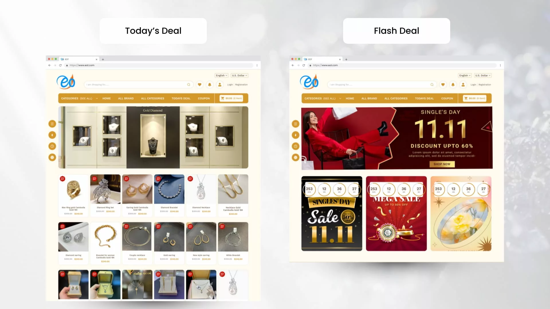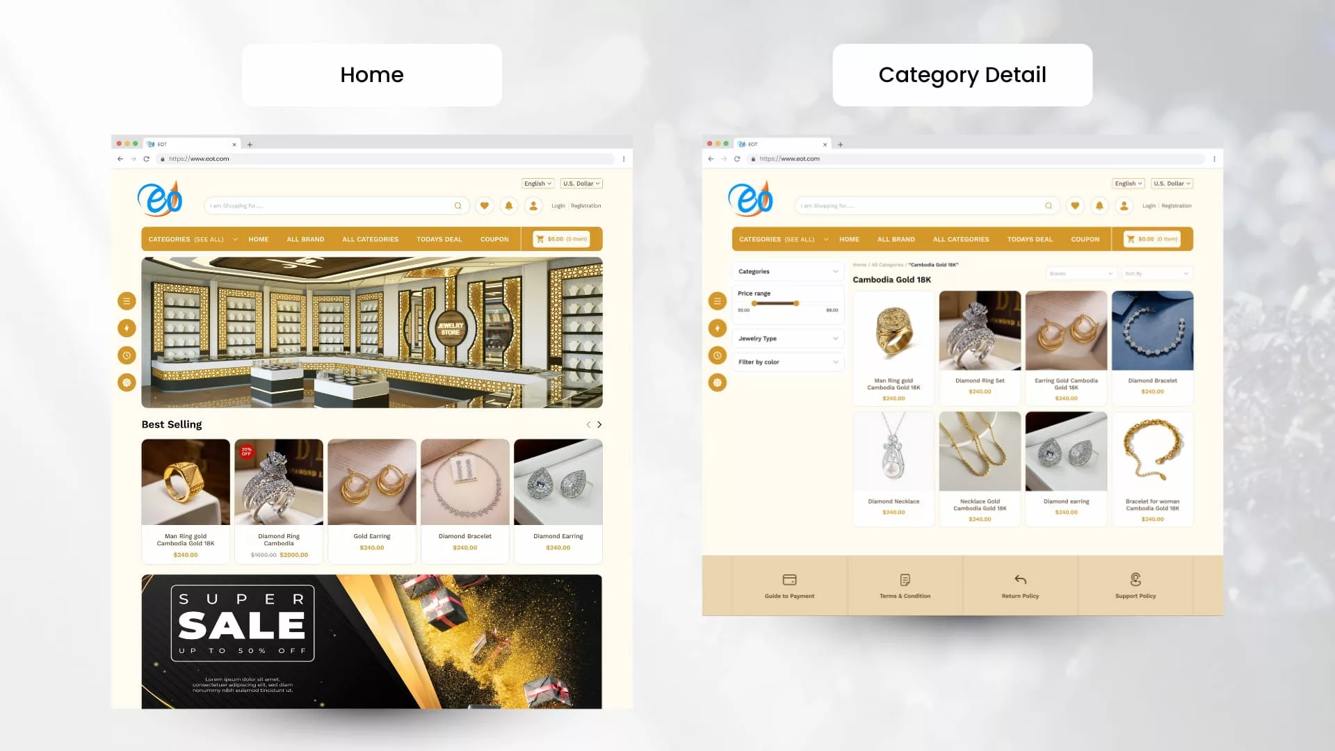 Displays jewelry items in organized categories such as rings, necklaces, bracelets, and earrings with high-quality images and pricing.